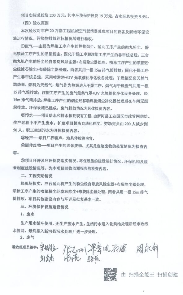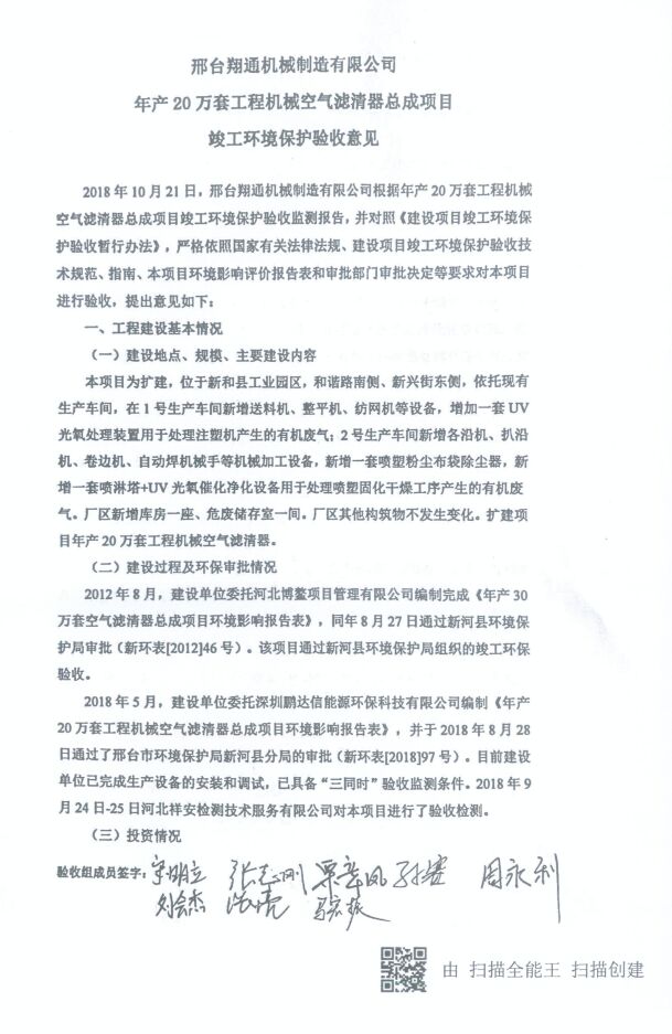 邢臺(tái)翔通機(jī)械制造有限公司年產(chǎn)20萬(wàn)套工程機(jī)械空氣濾清器總成項(xiàng)目竣工,環(huán)保保護(hù)驗(yàn)收意見(jiàn)。